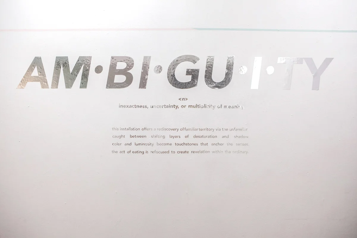 This installation offered a redisovery of familiar territory via the unfamiliar. Caught between shifting layers of desaturation and shadow, color and luminosity became touchstones that anchored the senses. The act of eating was refocused to create revelation within the ordinary.
